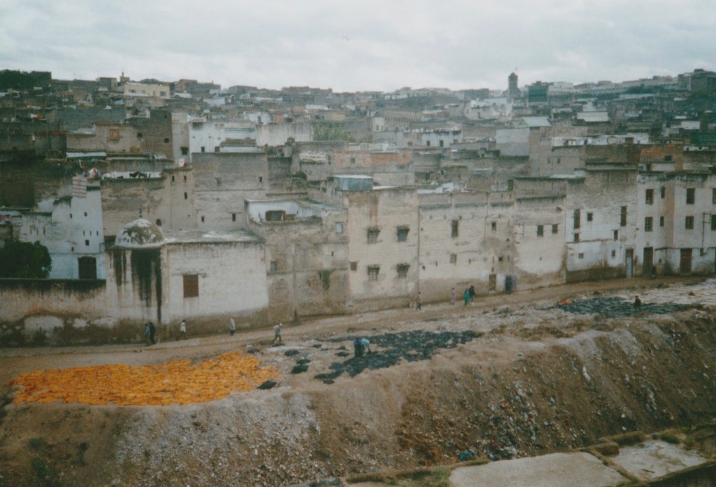 As we walked deeper into the city, through tunnels and small sqwuares, a tell-tale smell told us we were nearing the dye-pits. A dark corridor led us to a courtyrad where men wearing only shorts worked up to their knees in a series of concrete pits, stamping animal hides in brightly-coloured and foul-smelling liquids. We ascended a set of timbe stairs to a rooftop balcony where we looked down on the pits where 80 or so men worked knee-deep in the pits, kneading and tramping the leather.