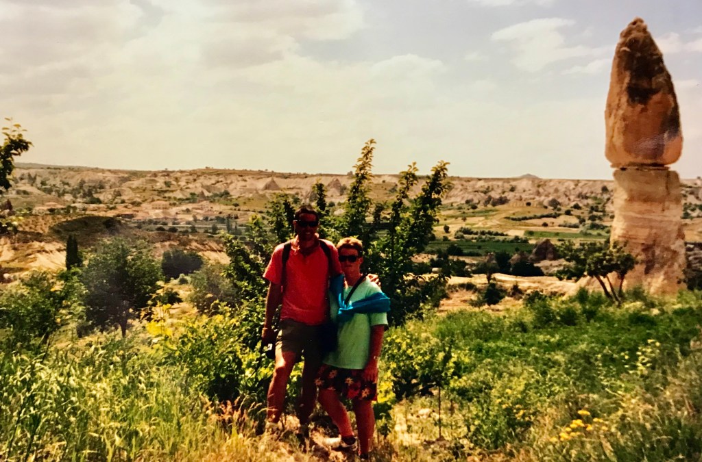 The 5 of us walked down past the farmers and the children gave us some fruit to eat. It wasn’t ripe but we pretended to eat and enjoy it. We wandered down the valley towards a strangely-eroded cliff then tried to follow a gully leading up into a maze of gullies. Eventually, we were stopped by a sheer cliff so we turned back and returned to Göreme.