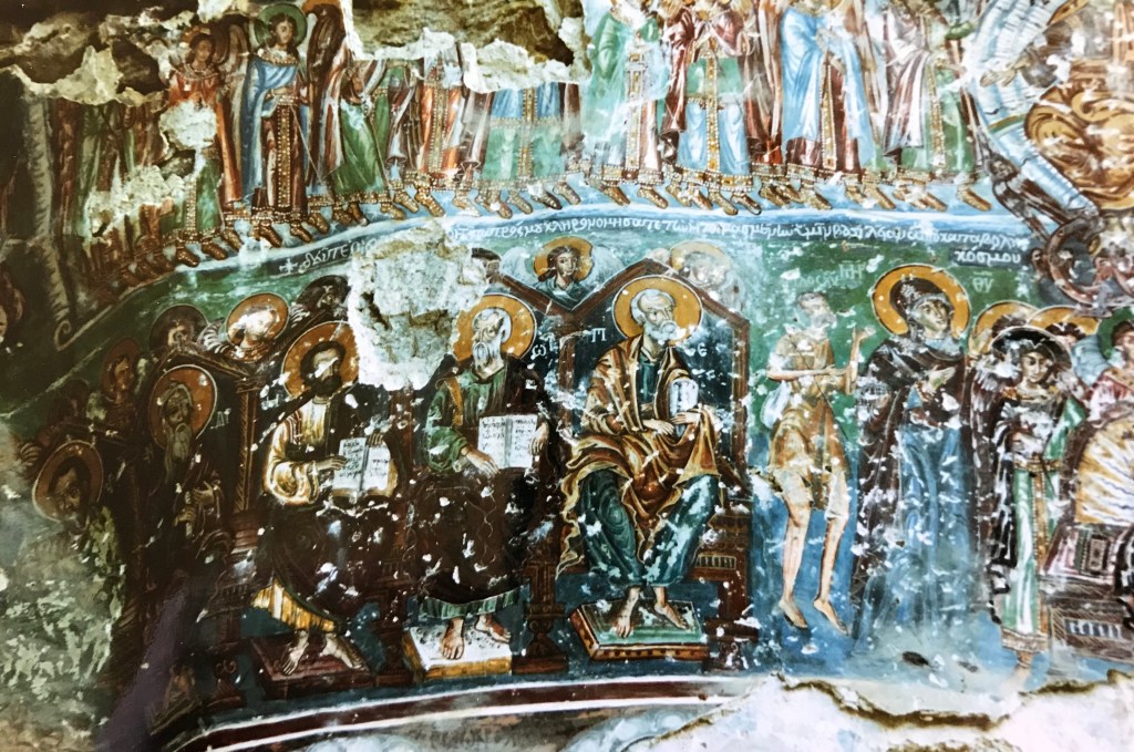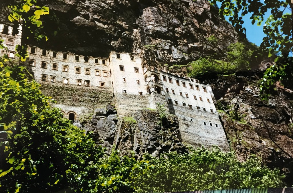 The drive up to the national park where the monastery is located took us along a wide shingle riverbed which gradually steepened as we moved further into the hills. We stopped for a ½ hour break in the town of Maçka, built where two rivers join and where the steep, scrubby hills were broken by sheer bluffs of hexagonal basalt columns. By the time we reached the entrance to the Altindere National Park, where the monastery is located, we were once again following a steep and cascading stream, its water leaping over the boulders as it rushed downwards beneath the thickly-forested hills.