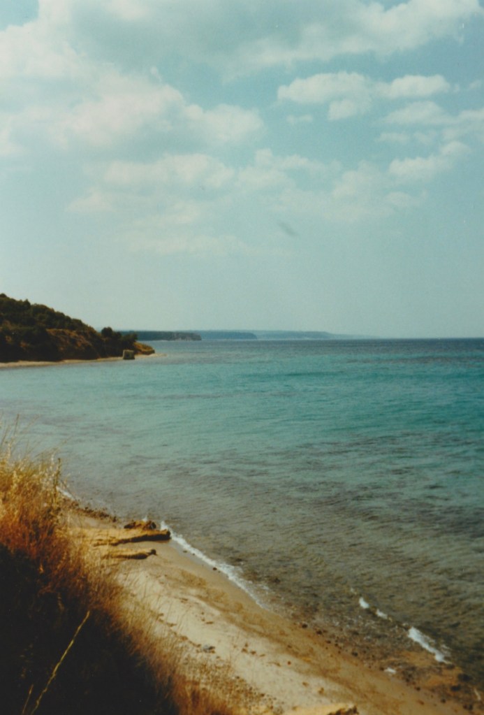 We were met on the other side by a dolmüs which drove us the 14 km to Anzac Cove on the Aegean side of the peninsula. Our first stop was a small graveyard where 365 Australian soldiers are buried beside the sea. There is always a wind blowing on the peninsula but still it was a calm and peaceful place. We walked along the dusty road to the small monument which marks Anzac Cove and Hussein told us the reason why the Anzacs landed there instead of at the correct landing site, called Brighton Beach, one 1/2 km to the south. Here, the soldiers were told, they could expect flat land and easy going but instead, they found themselves pinned down on a narrow beach with 100 foot cliffs above them. The reason for this was an uncharted current that swept the landing parties northwards in the dark.