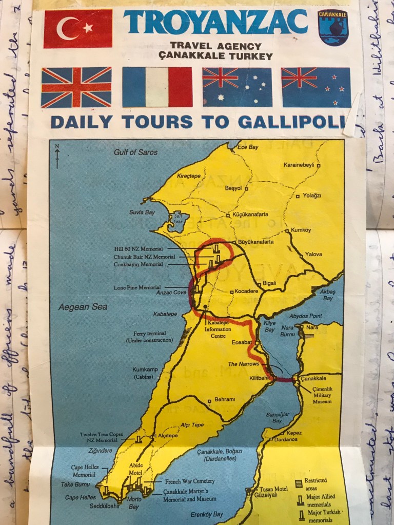 WEDNESDAY “AND THE BAND PLAYED WALTZING MATILDA” After having breakfast at a small restaurant we went around to the Troy Anzac Travel Agency to wait the departure of our trip over to the ANZAC battlefields at 10 a.m. Our guide was an oldish Turk called Hussain and once we were on board his minibus he began to tell us the facts about the Gallipoli campaign. The Narrows are only 1300m wide and the Allied plan was to sail up The Dardanelles and capture Istanbul, thus securing an ice free supply route for Russia. The campaign fell into 4 phases: