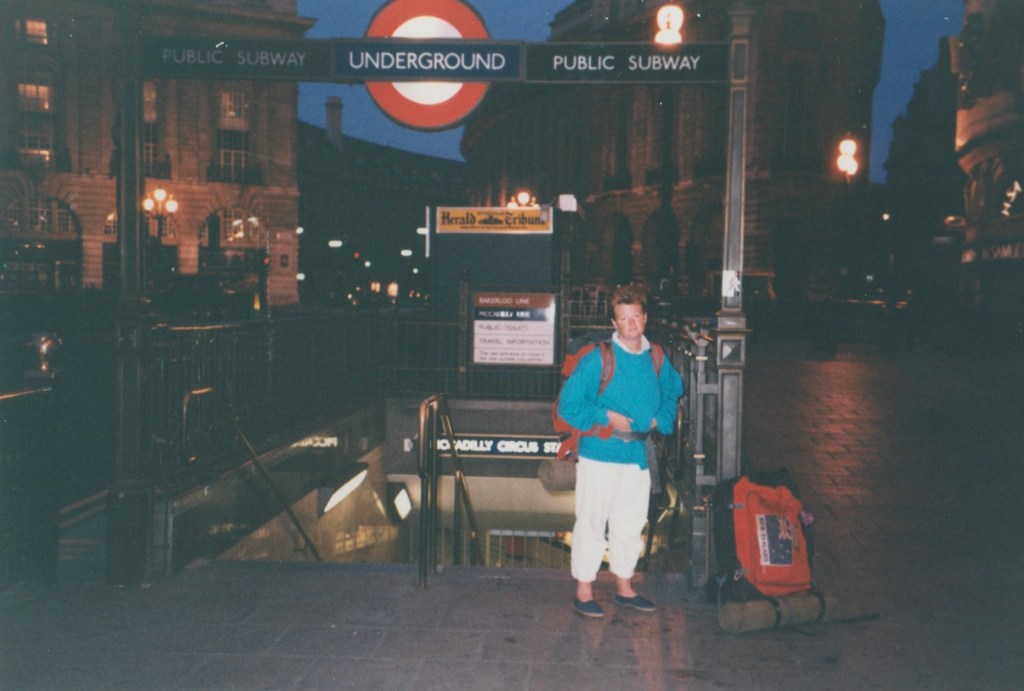 Amazingly, we got a ride almost at once with a lone British guy in a truck and he took us all the way to Lewisham where he followed a Night Bus until it stopped and we were able to ride it all the way in to Trafalgar Square. We walked up to Piccadilly Circus and found the Underground still closed so we sat down outside the station entrance among the other dossers, with the light of day coming fast into the sky and the volume of traffic already building, and waited…