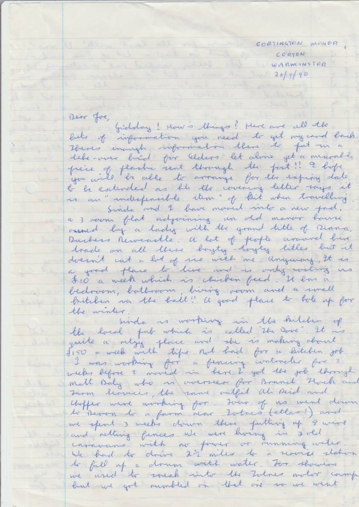 I was rather happy as I walked into town to do some grocery shopping and a few other things. While I was waiting for the bus back to Upton Lovell I wrote a letter to Mick and Roz [my cousin and his wife] sitting in the sun on the footpath.