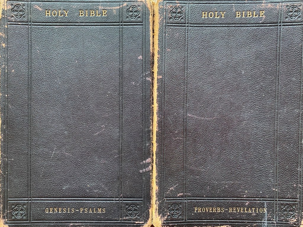 On Thursday Ann gave us two old family bibles. They are quite old and each has an inscription inside the front cover. The first volume, which is Genesis to Psalms, has the inscription: “Lucy Blakiston from her attached sister Sofia Noel Mackintosh, Sandybrooke, October 1868.”