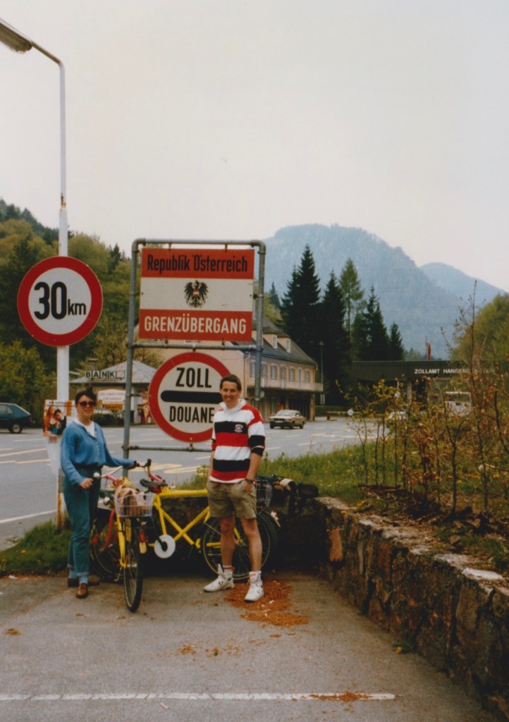 Back at the hostel, we hired a bike each for 50AS and set off to explore. A smooth, level pathway ran along the left bank of the Danube River and we followed it upstream and out of the city in the direction of the mountains. After an hour or so we stopped for a drink at a pub then carried on until we reached a dam across the river where we crossed over and set off up a side stream to find somewhere to have lunch. Our picnic consisted of bread, salami, cheese and fruit, eaten beside the river on a bank of bright green grass.