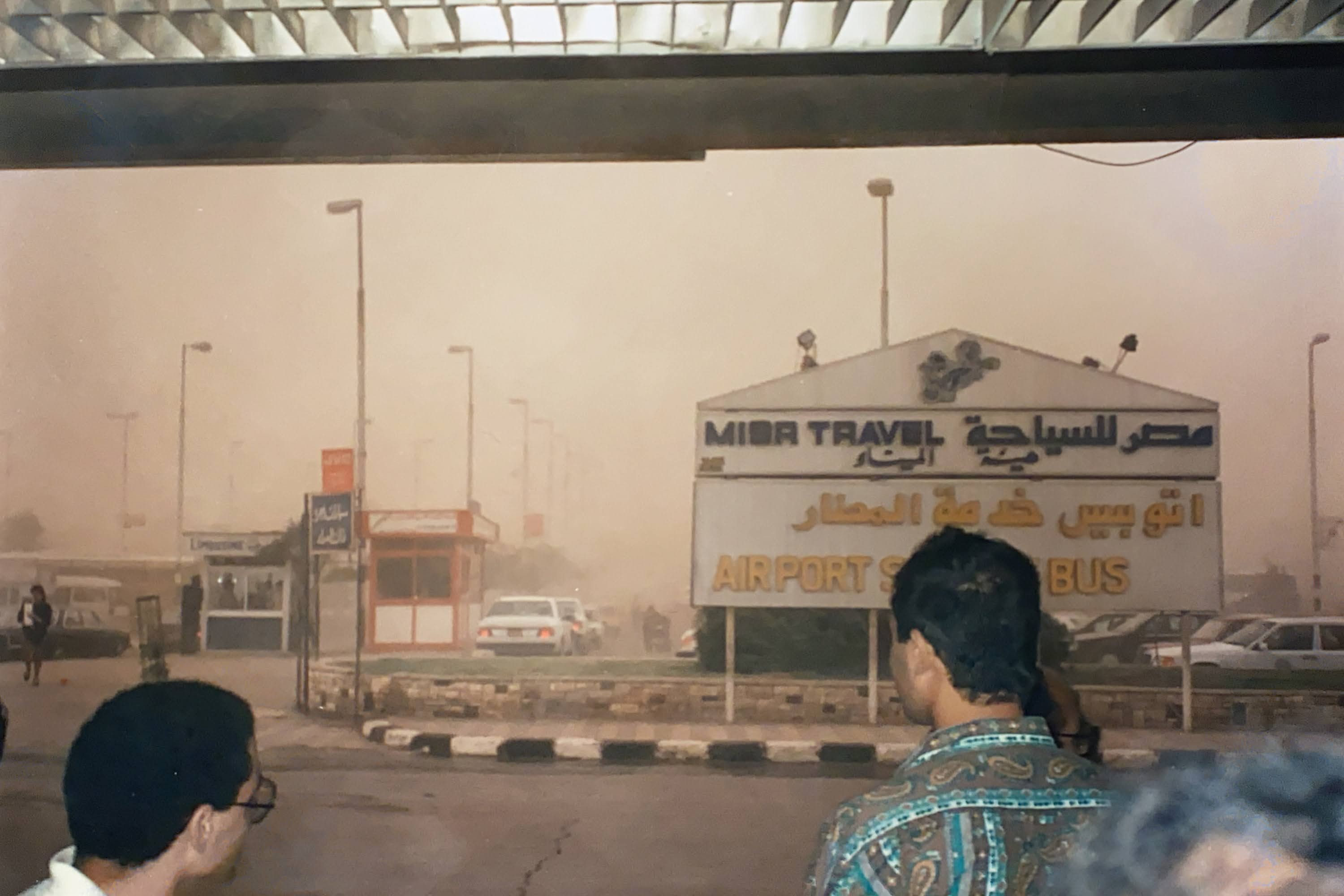 Getting to the airport was a simple matter. We walked up to Midan Tahir where a tout grabbed us and popped us into a brand new minibus which took us all the way for one Egyptian pound each. We were just putting on our packs after getting out of the van when the dirty brown tendrils of a sandstorm began to drift in on the rising wind. By the time we had dashed into the shelter of the arrivals hall, a howling gale was lashing rain and sand across the airport, pummelling the trees and sending pieces of debris racing past.