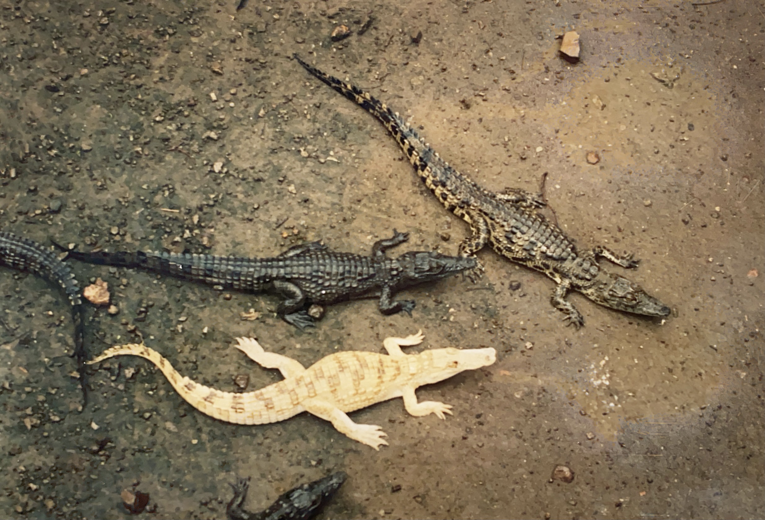Back at camp we put on some dry clothes, then hired a couple of bicycles and cycled the five kilometres out of town to the Spencers Creek Crocodile Farm. They had an impressive range of crocs, ranging in size from little footlong hatchlings up to a 12-foot Silurian monster, sunning himself beside the fence with a smug look on his face. A well set-out group of cages housed a leopard, several wild cats, and a serval, and there was also an informative AV program about crocodiles and other aspects of conservation.