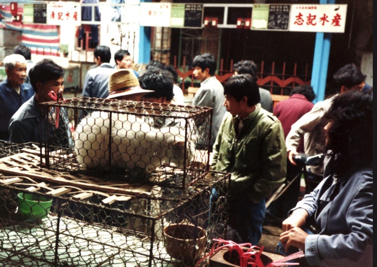 Back of the Shaomin Island part of town, we spent an hour or so in the fascinating Chingping Market where row upon row of animals, fish, reptiles and plants were for sale: skinned dogs, cats, birds and small mammals, fish with their hearts still beating as they were filleted, cats in cages awaiting purchase and death, buckets of toads, baskets of eels, tanks of fish, dried snakes coiled and basketed, deer velvet hanging amongst dried bats, rat’s tails, dried fruit, and everywhere a bustle of people and an avalanche of smells.