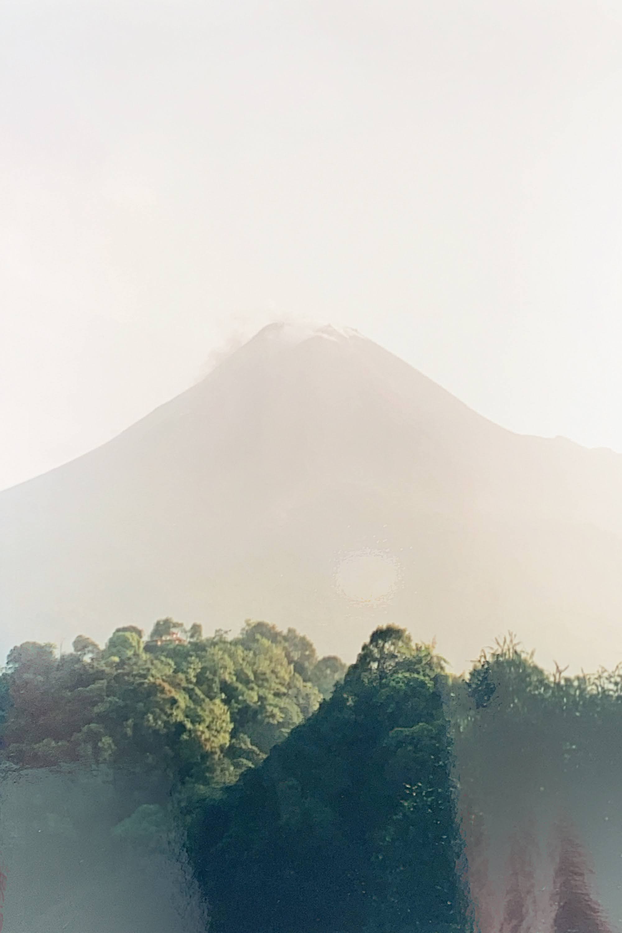 The sunrise was only mediocre: but with an erupting volcano, the solid green mass of the jungle, and the orange disc of the sun muted by hazy cloud, the whole picture was primaeval and eerie. We spent an hour on the hilltop until the sun was fully into the sky and the view of the mountain was becoming hazy. Descending the hill, we paused for a rest about halfway down and as we stood amongst the trees, a massive rumble came from the mountain as a stream of molten rock and semisolid lava crashed down the southwest face, raising a cloud of smoke and continuing down almost to the tree line on the far side of the valley from where we stood.