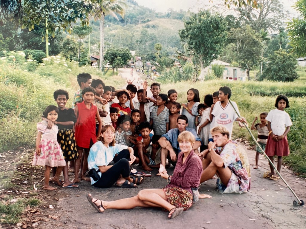 We found a place to stay and then had some food at a little family-run restaurant overlooking the valley. Thierry went off to reconnoitre the route up Keli Mutu and Ed, Michelle, Trish, Linda and I went for a walk down the road out of town towards the distant sea, accompanied by about 40 local kids. We took a lot of photos of them and Ed and I climbed a tree with some of them before they all went home happy.