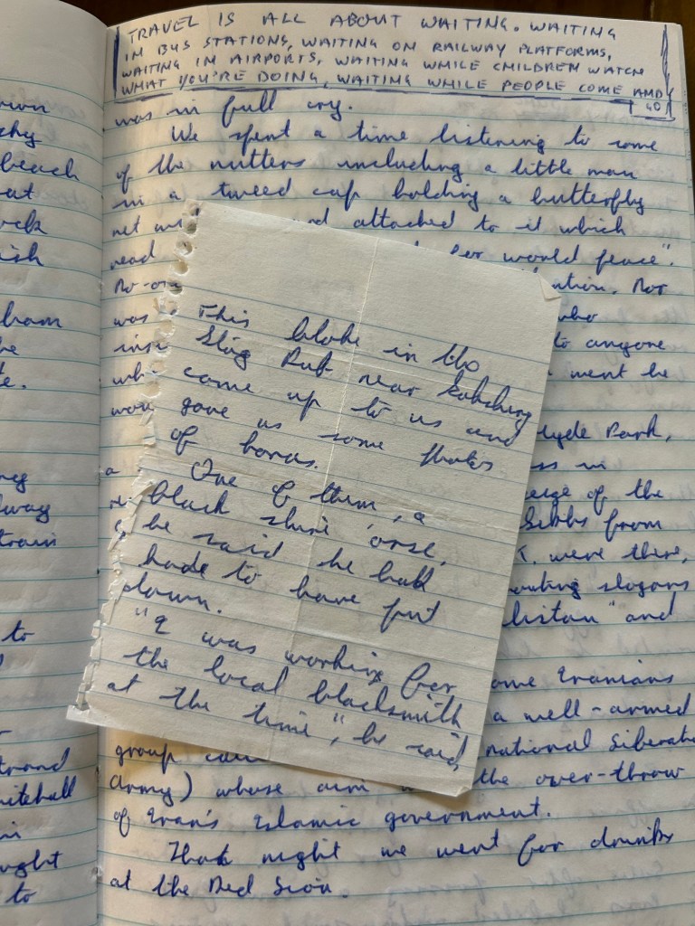 Travel is all about waiting. Waiting in bus stations, waiting on railway platforms, waiting in airports, waiting while children watch what you’re doing, waiting while people come and go. This is a note that I wrote at some little pub in Salisbury.