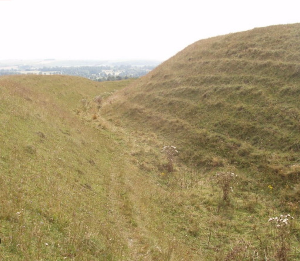 I’ve just stopped on top of a tumultus, looking over BishopStrow. Just now, I’m walking around the lowermost ditch. Must have been very hard digging here in the chalk soil and flint. But the fortifications would have proved a formidable obstacle for anyone trying to attack it.