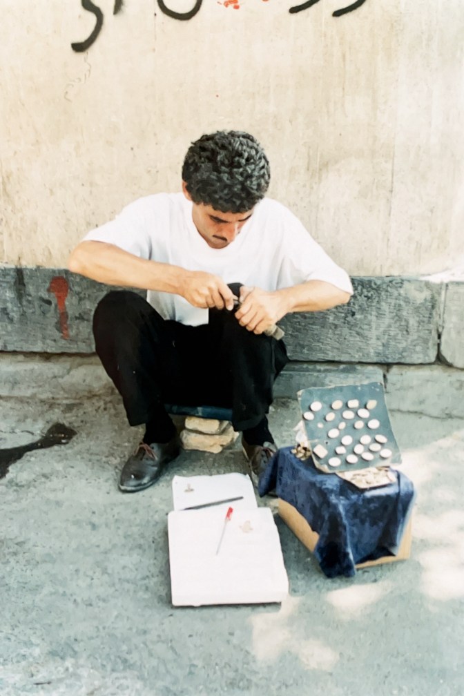 We took a shared taxi down to Khomeini Square and walked along to the post office, outside of which sits a man who engraves names written in Farsi on small brass stamps. Shahab had written us a letter to give him, and he quickly and deftly inscribed our names for us at a cost of 4,000 Rials. Linda took his photo, and he asked us to send him a copy. He surprisingly spoke a little English.