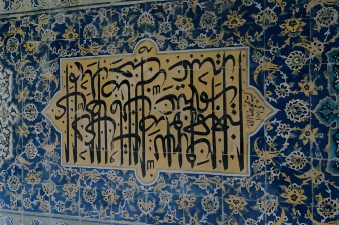 Entering the north-facing gate into the east-facing courtyard of the mosque, we walk through a series of vaulted corridors to emerge in front of the huge main cupola. The entire mosque is faced with delicate tilework in many different shades of blue. Flanking the main cupola stand two beautifully proportioned minarets, dark blue in the bright light. There are several quiet side courtyards with cool, shady trees growing in them, and we rest a while under one of these.