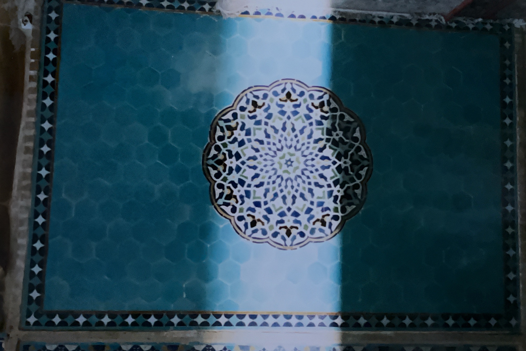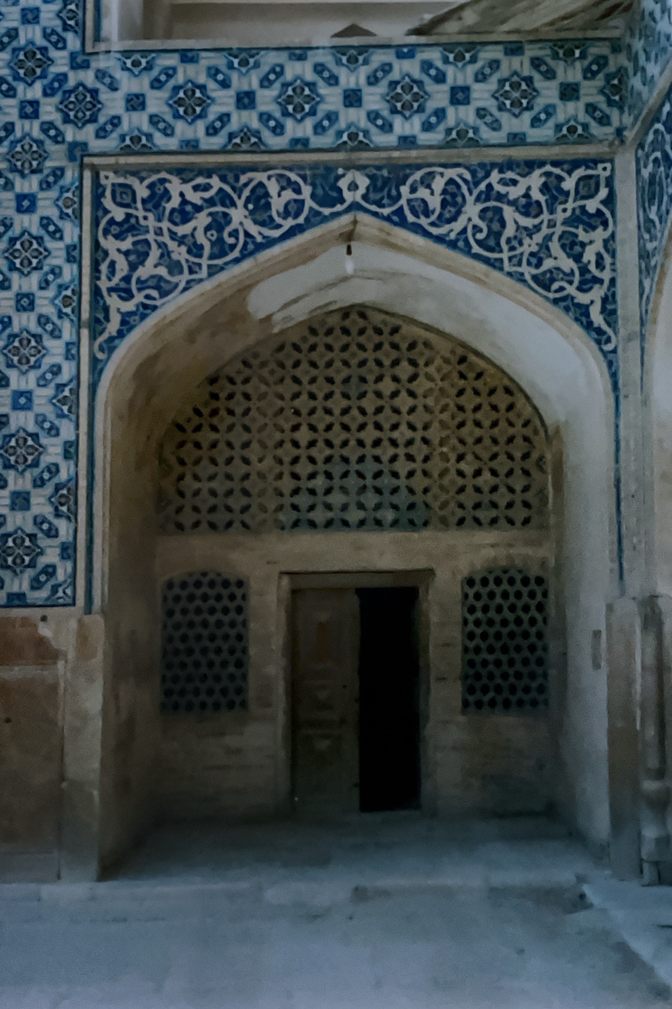 Entering the north-facing gate into the east-facing courtyard of the mosque, we walk through a series of vaulted corridors to emerge in front of the huge main cupola. The entire mosque is faced with delicate tilework in many different shades of blue. Flanking the main cupola stand two beautifully proportioned minarets, dark blue in the bright light. There are several quiet side courtyards with cool, shady trees growing in them, and we rest a while under one of these.