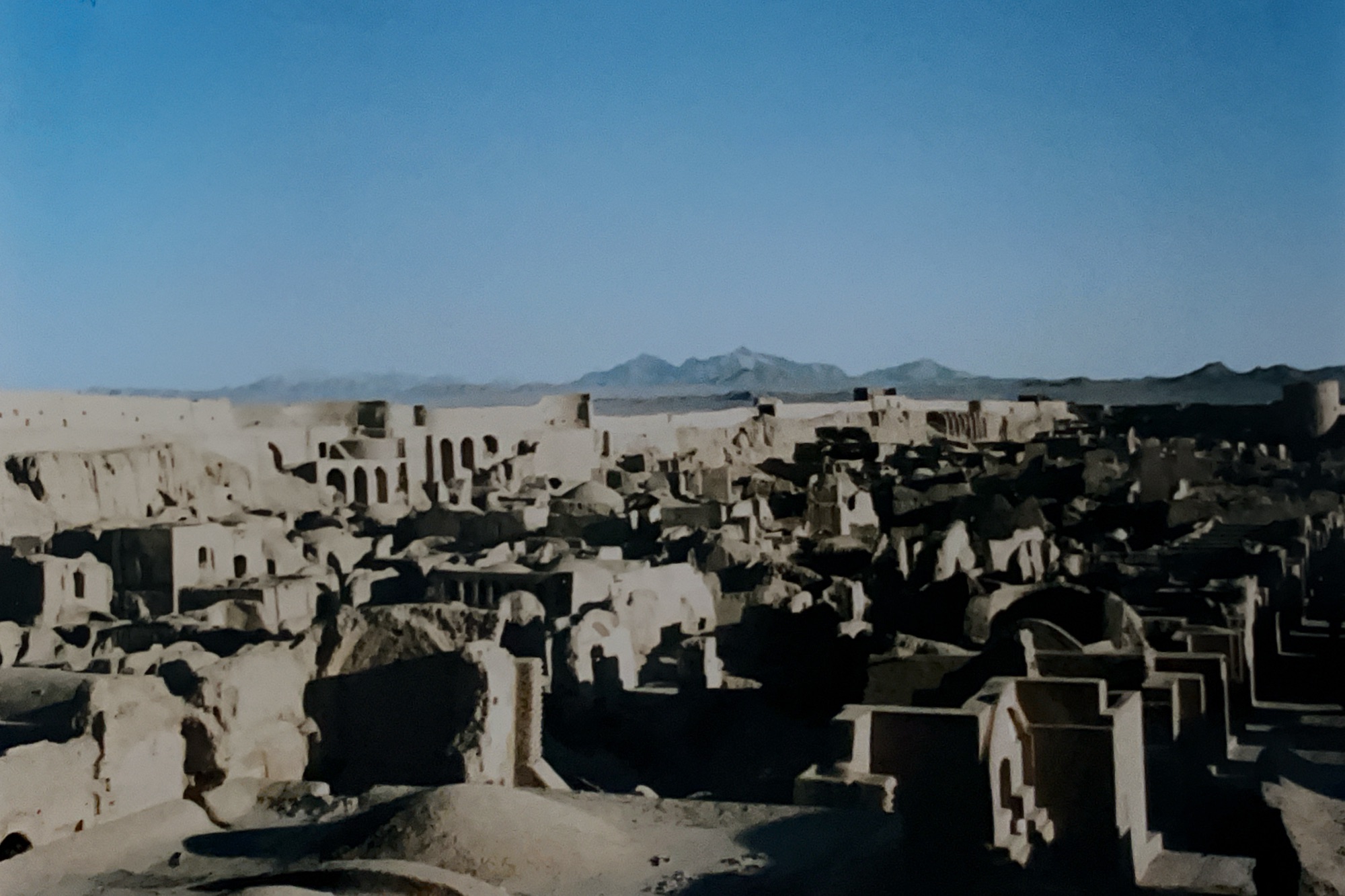 We climb some stone steps to a vantage point on the outer wall, which stretches unbroken around the entire perimeter of the city, culminating in the citadel, which stands resolute and impregnable on the north side of the old city. The sky is deep blue and the low angle of the sun creates a complex interplay of shadow and shade amongst the contorted ruins of the city. We walk along a cobbled path through the ruined houses, stables, bazaars and mosques. A few shambling workmen push wheelbarrows along and shovel rubble in a desultory fashion.