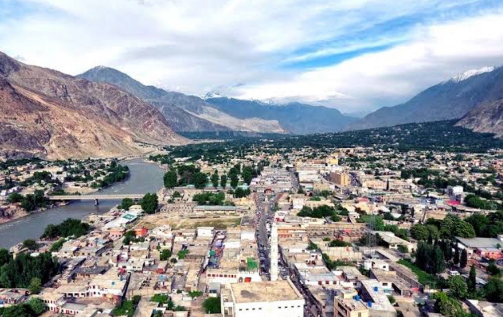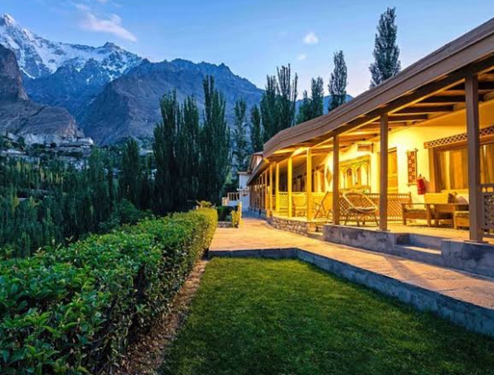 On the way back up the street, we stop to look at the wares of a boy selling knives. We buy two small pocket knives for ₹20 each: one for me, one for [Linda’s brother] Shane. Back at the Hunza Inn, we relax out on the veranda until 4:30 PM when a group of us sally forth to the Gilgit Serena Lodge expecting to watch a free video while munching cheese and tomato toasties. But the free videos are no longer a feature of the Serena scene. The toasties, however, are still quite nice. Outside the hotel’s large windows, a spectacular show of light is taking place across the flanks of the mountains beyond the Gilgit River. The stern, triangular peak of Haramosh is wrapped in cloud as darkness draws its black veil over the valley.