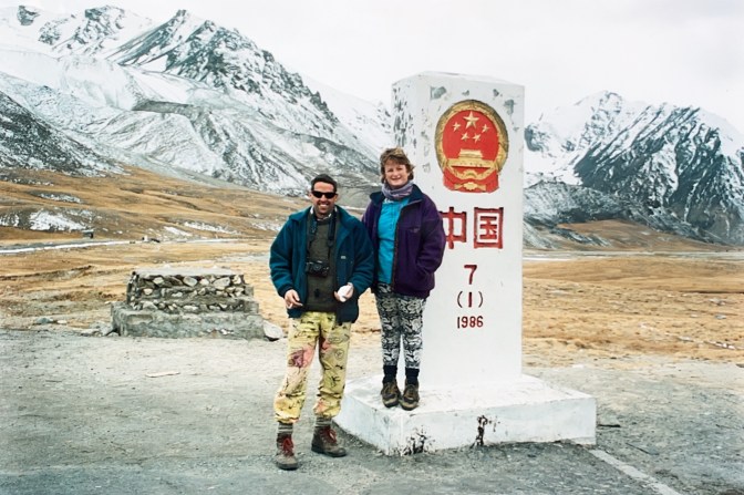 At 15,000 feet in, the air is clear and cold. We celebrate our arrival with cigarettes and photographs. In front of us, the Pamir Range in China; behind us, the Karakoram Mountains and Pakistan. Several jeep loads of Pakistanis are at the pass for a day trip. Some of them take photographs of us.