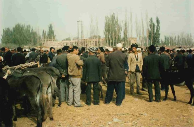 The local market is a smaller version of the Kashgar Sunday market, but we visit it en masse —Blue, Kerry, Mike, who arrive during the night, Linda, and I — for a look anyway. The livestock compound is jammed with people buying and selling animals, mainly sheep, donkeys, goats, and cattle. I watch, to great local hilarity, the procedure for selling the cattle. An intermediary, like a stock agent in New Zealand, brings buyer and seller together, and the price is negotiated. In the final stages of bidding, the intermediary extracts a note from the buyer’s roll of money, then places it in the buyer’s hand. He then slaps the buyer’s hand into the hand of the seller. If the seller accepts the price, he takes the money; if not, he rejects it. Presumably, the mediator takes a commission for his efforts, and a lot of money was changing hands. I calculated that each beast went for about ¥200.
