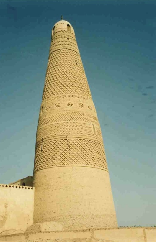 The minaret was well worth the walk. Built entirely of mud, it has a graceful tapered shape and stands amid a number of brick kilns, with which it competes for the attention of one’s eye. The surrounding land was a sea of grape arbours, the grapes now harvested, but the foliage still thick and lush.