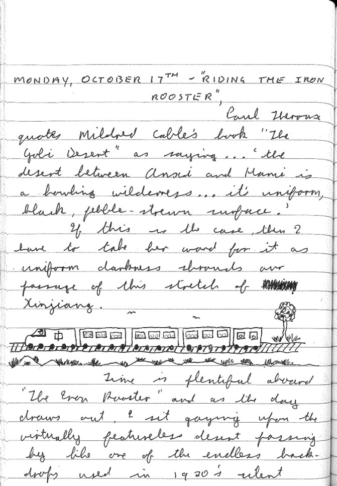 In his book, Riding the Iron Rooster, his account of travelling through China by train in the mid-1980s, the American travel writer Paul Theroux quotes Milgrid Cable’s book, The Gobi Desert, as saying, “The desert between Anxi and Hami is a howling wilderness, its uniform, black, pebble-strewn surface.” If this is the case, then I have to take his (and her) word for it, as uniform darkness shrouds our passage of this stretch of Xinjiang.
