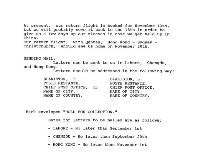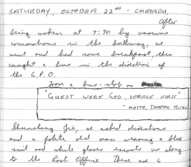 Outside on the pavement, people are lined up selling stamps, coins, and Chinese memorabilia. I swap a New Zealand stamp and one kuai for a tinny badge of Chairman Mao. Further down the street, we find a cafe, and with Phil Collins playing in the background, read our mail. We spend most of the rest of the day back in our hotel room watching TV.