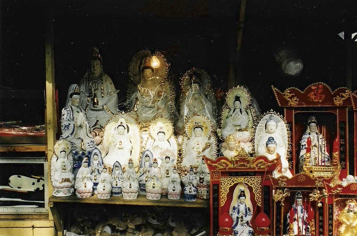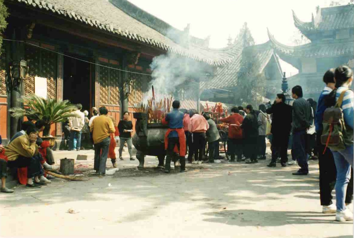 We get lost finding our way back into the centre of the city. Buses suddenly terminate, route numbers suddenly change along with street names. But around midday we find our way to the alley leading down to the Wenshu Monastery. The alley is a riot of colour. Small stalls sell paraphernalia for the appeasement of the Buddha. There are joss sticks in sizes ranging from knitting needle size up to baseball bat size. Stacks of imitation money, incense burners, garish posters of the Buddha, paper wreaths of pink and red and orange, and a dense press of people and bicycles.