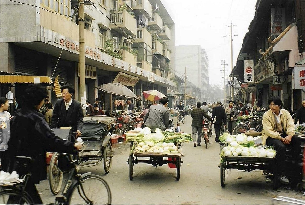 The air of Chengdu is thick with pollution, and as we cycle, our eyes begin to sting and our throats ache. We stop briefly to photograph another giant statue of Mao, then cycle up to the river and lunch on jiǎozi [dumplings] and spicy noodles. After lunch, we set off in search of Renmin Park, following a network of back alleys teeming with life. The street markets here are a colourful blend of food stores, clothing merchants, and tinkers of all sides. Basins of live, and nearly live, fish line the gutter in a corner. Here, stacks of eggs await sale. Merchants squat behind piles of greens, cabbages, spinach, radishes. There, cages full of chickens and ducks. Snack hawkers sell dumplings, nuts, noodles, and kebabs. Several video game parlours are crowded with young people playing the latest games. Above the street, floor after floor of apartments, washing hanging everywhere, and twisted networks of plumbing.