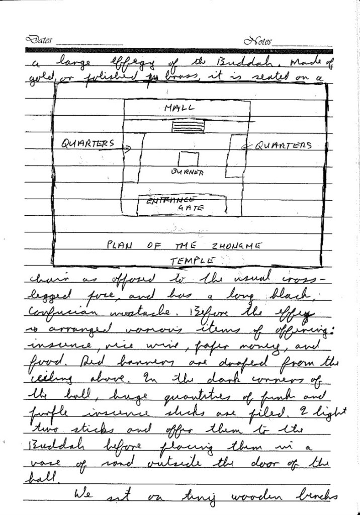 The temple consists of an inner courtyard containing a large burner, around which stand living quarters, and at the back a large hall containing an immense effigy of the Buddha. Made of gold or polished brass, it is seated on a chair as opposed to the usual cross-legged pose and has a long black Confucian moustache. Before the effigy are arranged various items of offering, incense, rice wine, paper money, and food. Red banners are draped from the ceiling above. In the dark corners of the halls, huge quantities of pink and purple incense sticks are piled. I light two sticks and offer them to the Buddha before placing them in a vase of sand outside the door of the hall.