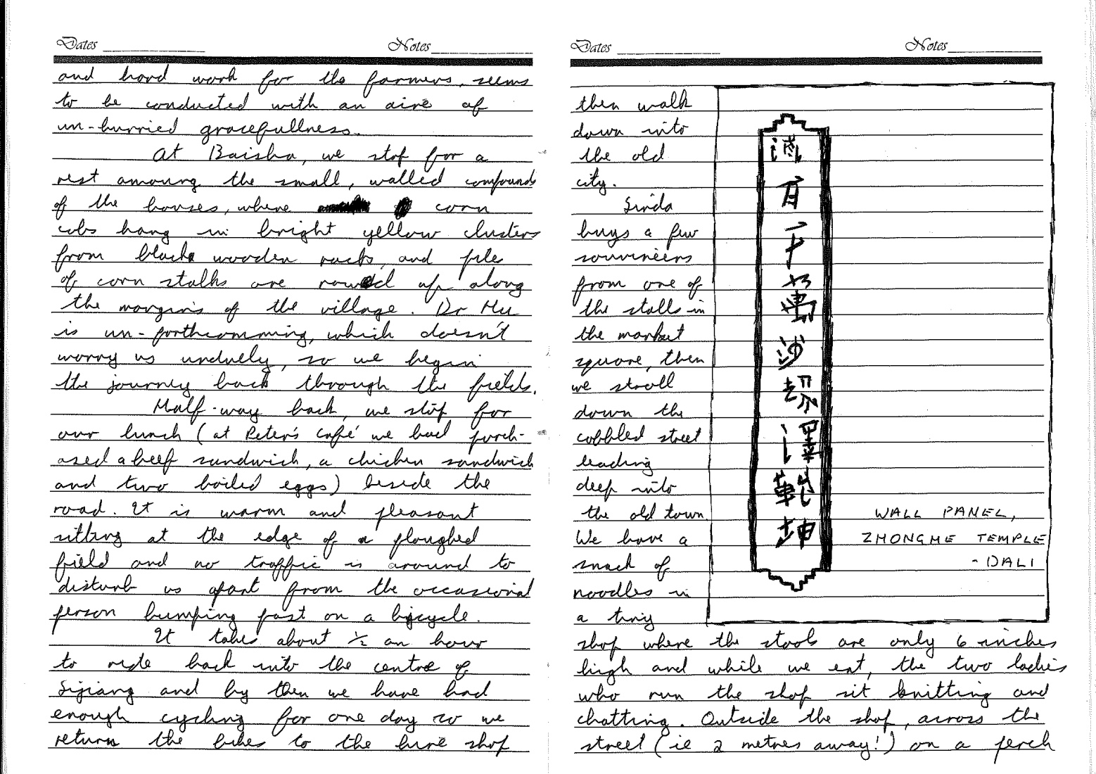 We leave the hotel at 8.15am and set off to climb up to the Zhonghe Temple, perched halfway up the forest-clad mountain standing above the town. The temple’s red tile roof is just visible amid the deep dark green of the forest as we walk up a cobbled street towards the foot of the mountain. In the early morning sun, the webs of giant striped spiders shimmer like spun glass draped between the trees and around the eaves of buildings.