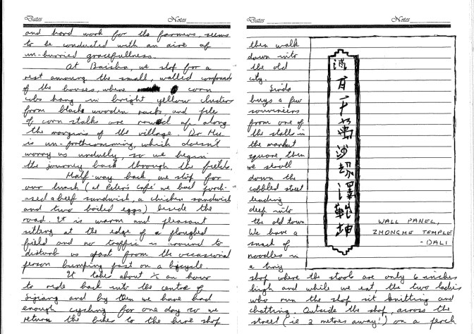 The cobbled street becomes a narrow concrete lane between stone walls, then a dirt path leading out of the village and up through the terraced farmland of a small valley. Below the town, Erhai Lake is hidden in haze, but above us the mountainside is clear. The path is worn deeply into the clay in places, and it winds gently upwards through the terraced fields where locals toil amongst neat rows of vegetable seedlings. The valley ends in a cup-shaped amphitheatre at the foot of the hill, and the path begins to ascend steeply through groves of eucalypt trees.