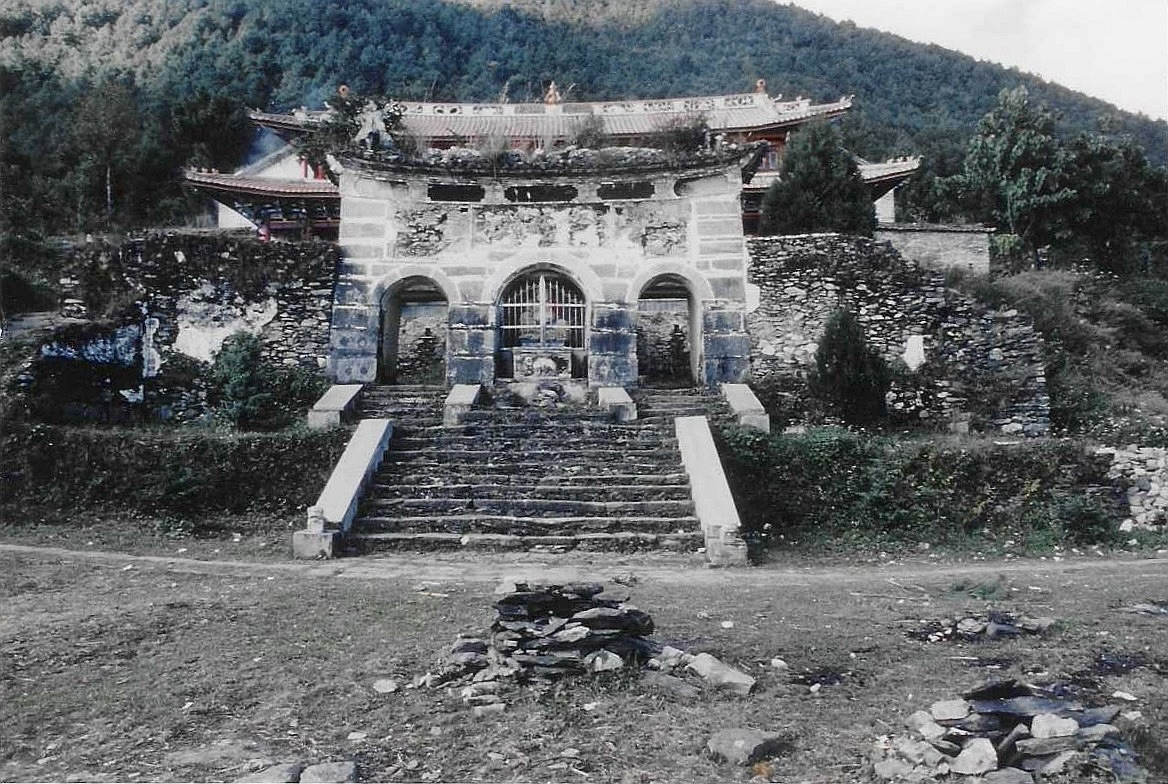 We follow a cobbled path, in some places rising steeply upwards in a series of steps, in other places traversing the hillside in almost flat stretches. It takes about two hours to reach the temple, which is presaged by two tumbled-down stone buildings containing small altars upon which are placed small cups of rice wine, paper, and incense.